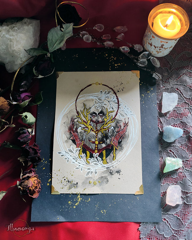 L'illustrazione è montata su "passe-partout", nero e china oro 21x30cm, pronta da essere incorniciata.