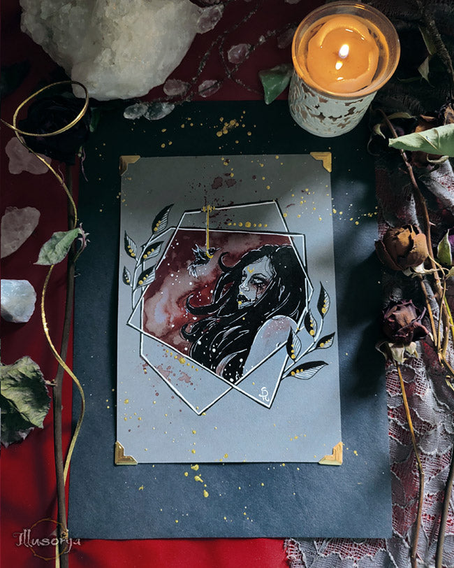 L'illustrazione è montata su "passe-partout", nero e china oro 21x30cm, pronta da essere incorniciata.