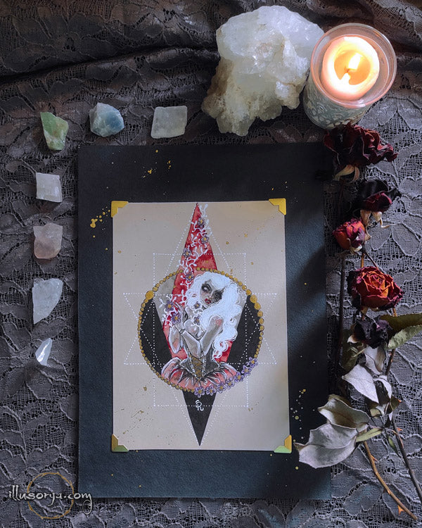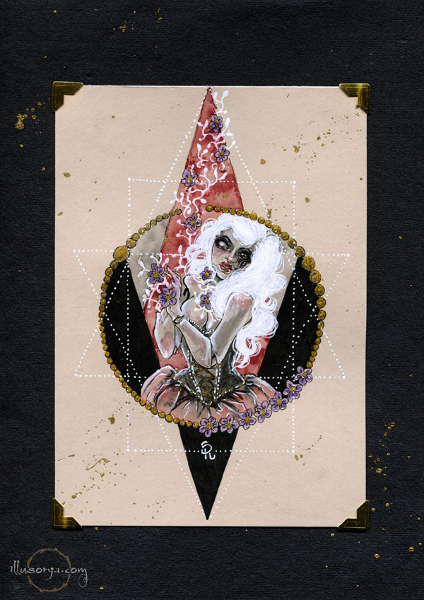 L'illustrazione è montata su "passe-partout", nero e china oro 21x30cm, pronta da essere incorniciata.