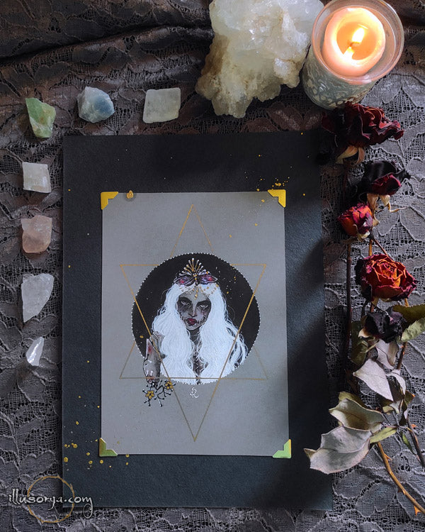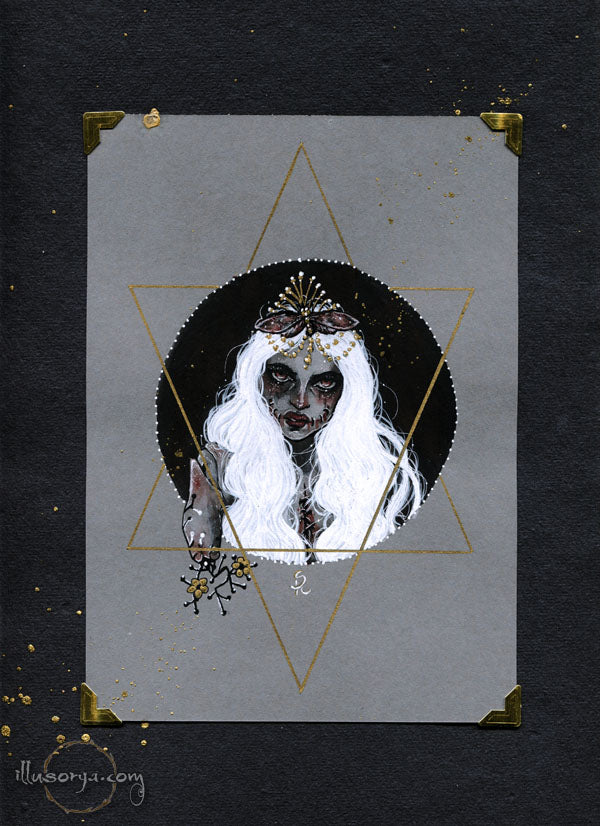 L'illustrazione è montata su "passe-partout", nero e china oro 21x30cm, pronta da essere incorniciata.