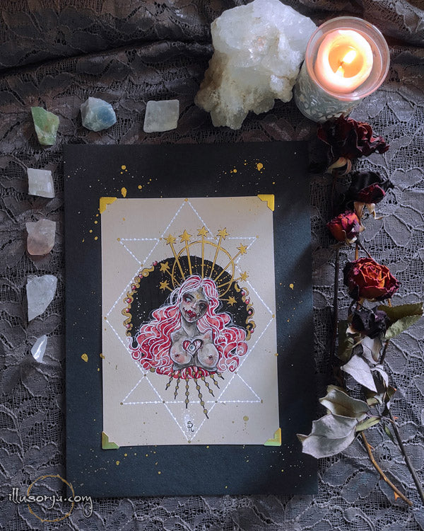 L'illustrazione è montata su "passe-partout", nero e china oro 21x30cm, pronta da essere incorniciata.