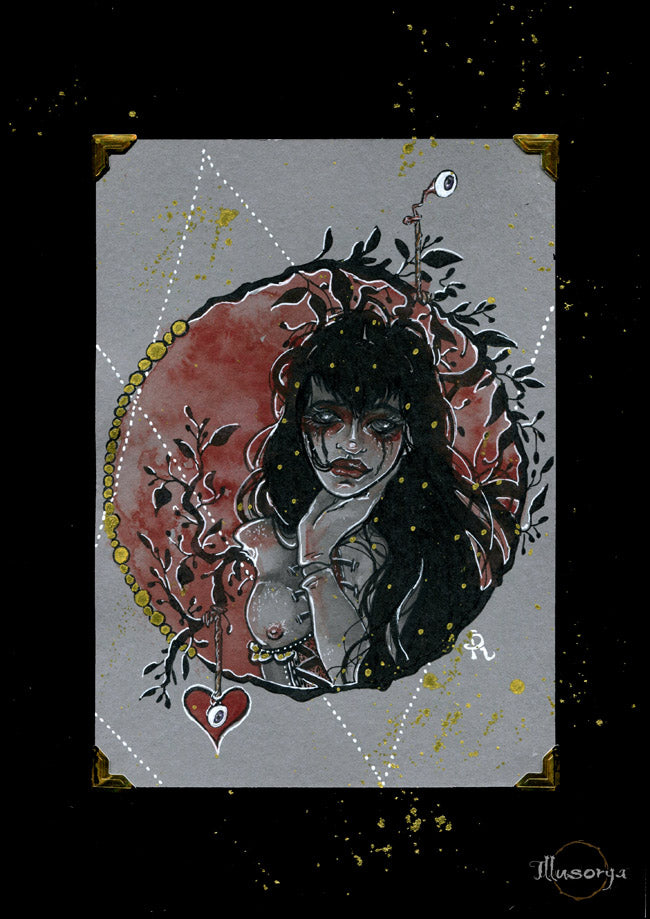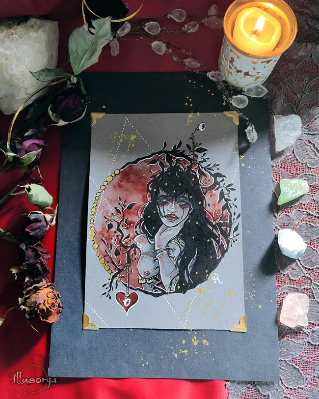 L'illustrazione è montata su "passe-partout", nero e china oro 21x30cm, pronta da essere incorniciata.