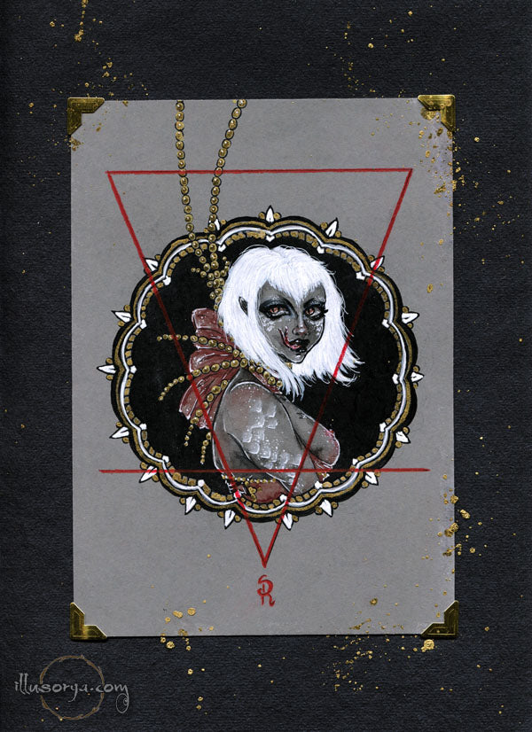 L'illustrazione è montata su "passe-partout", nero e china oro 21x30cm, pronta da essere incorniciata.