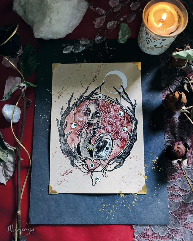 L'illustrazione è montata su "passe-partout", nero e china oro 21x30cm, pronta da essere incorniciata.