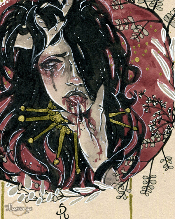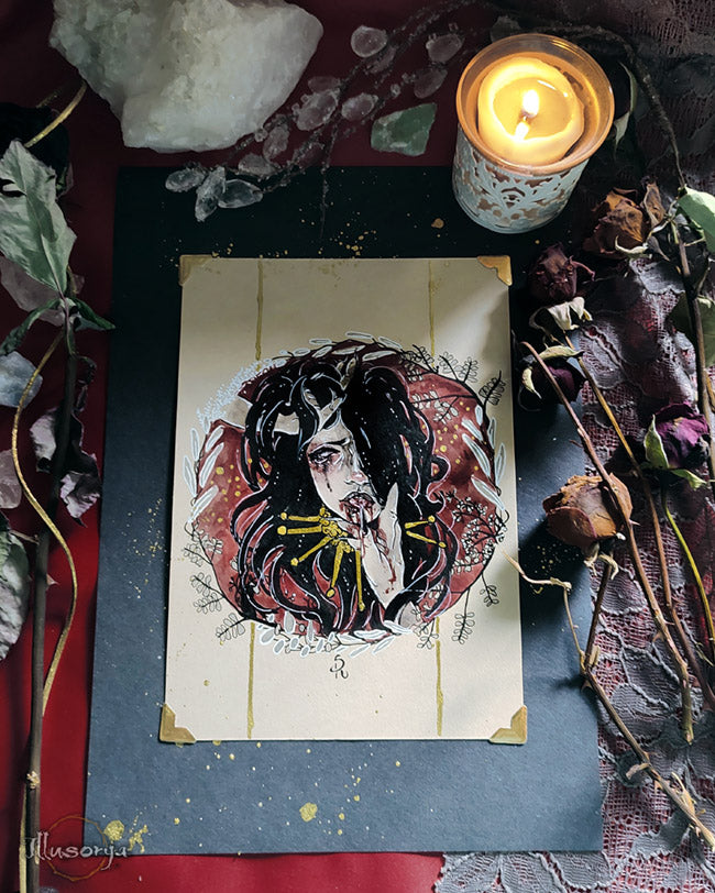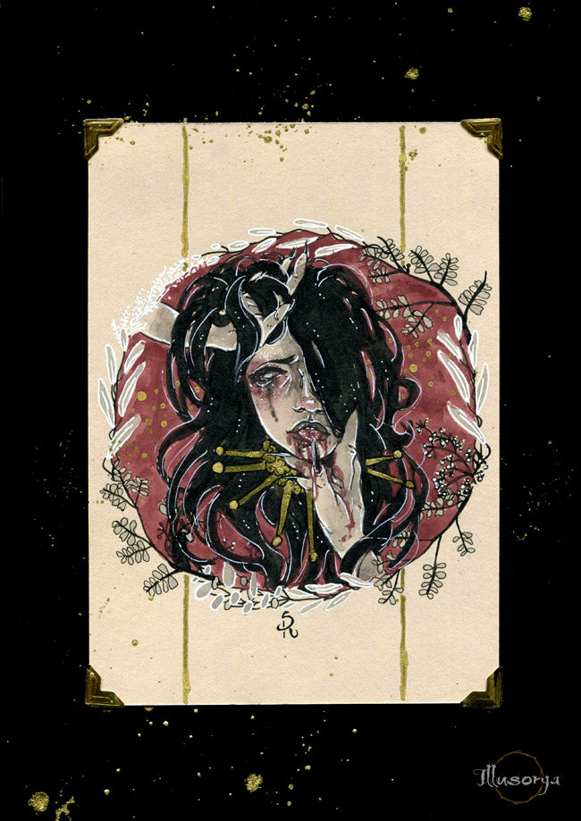 L'illustrazione è montata su "passe-partout", nero e china oro 21x30cm, pronta da essere incorniciata.