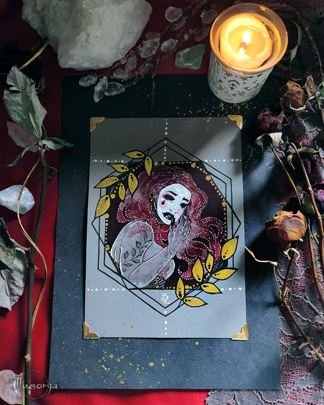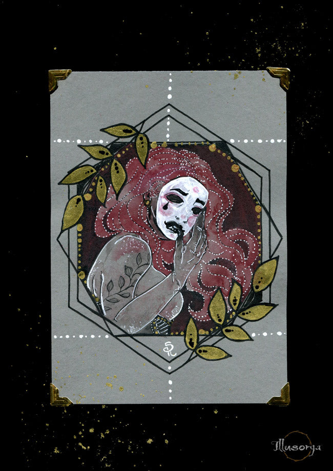 L'illustrazione è montata su "passe-partout", nero e china oro 21x30cm, pronta da essere incorniciata.