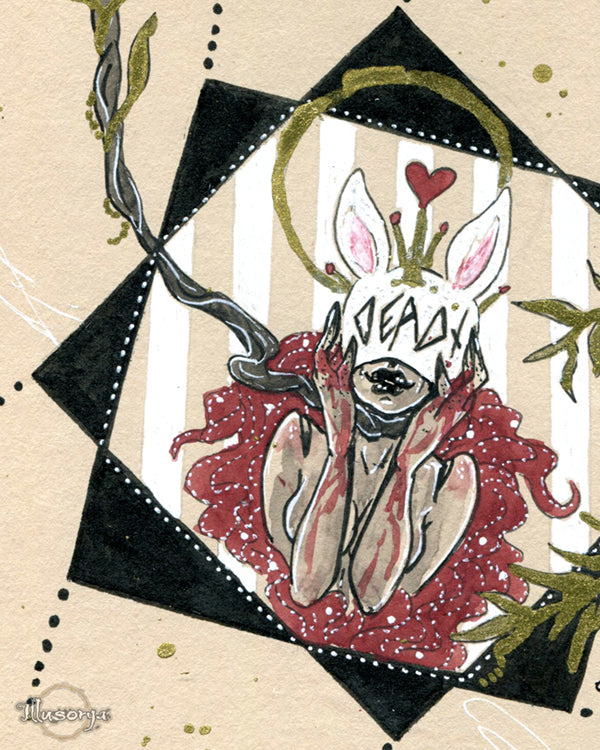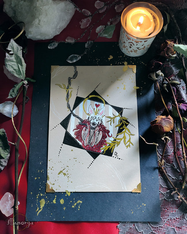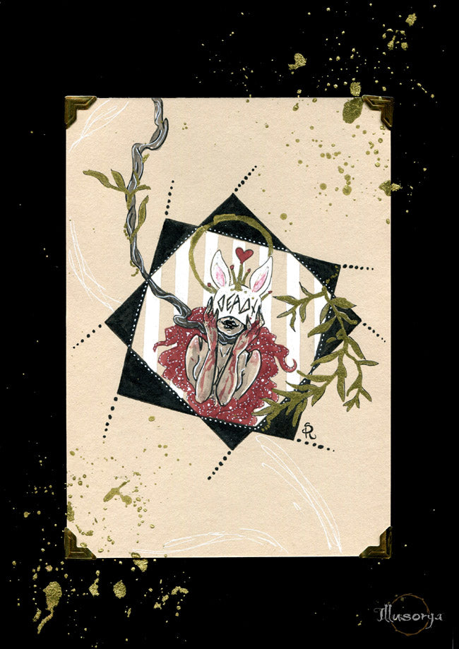 L'illustrazione è montata su "passe-partout", nero e china oro 21x30cm, pronta da essere incorniciata.
