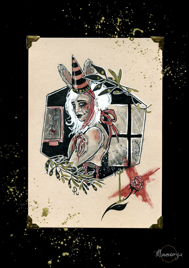 L'illustrazione è montata su "passe-partout", nero e china oro 21x30cm, pronta da essere incorniciata.