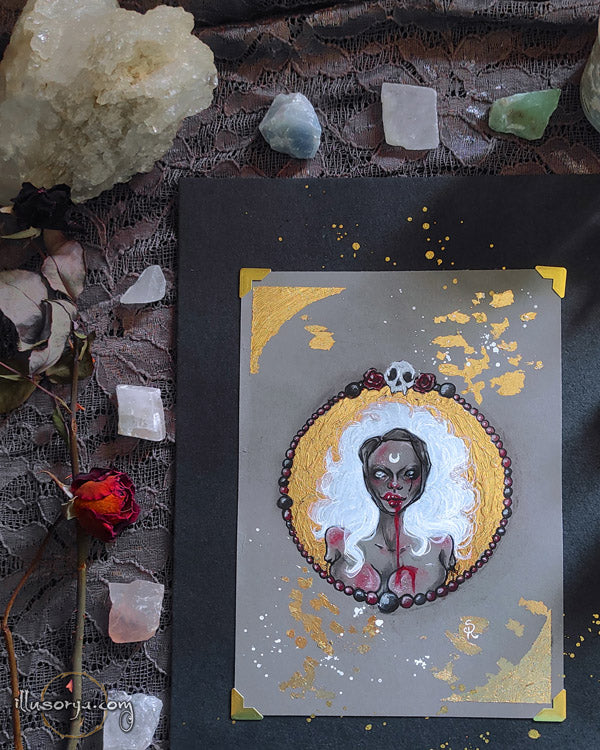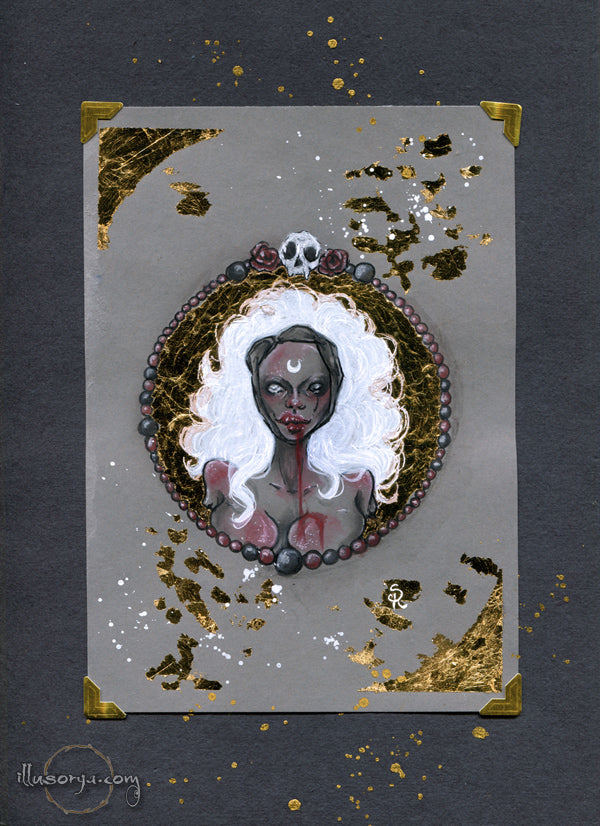 L'illustrazione è montata su "passe-partout", nero e china oro 21x30cm, pronta da essere incorniciata.