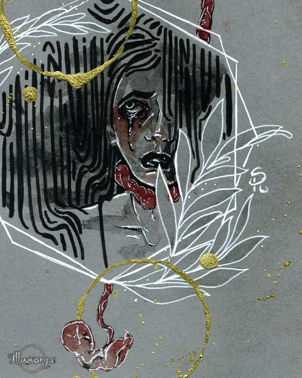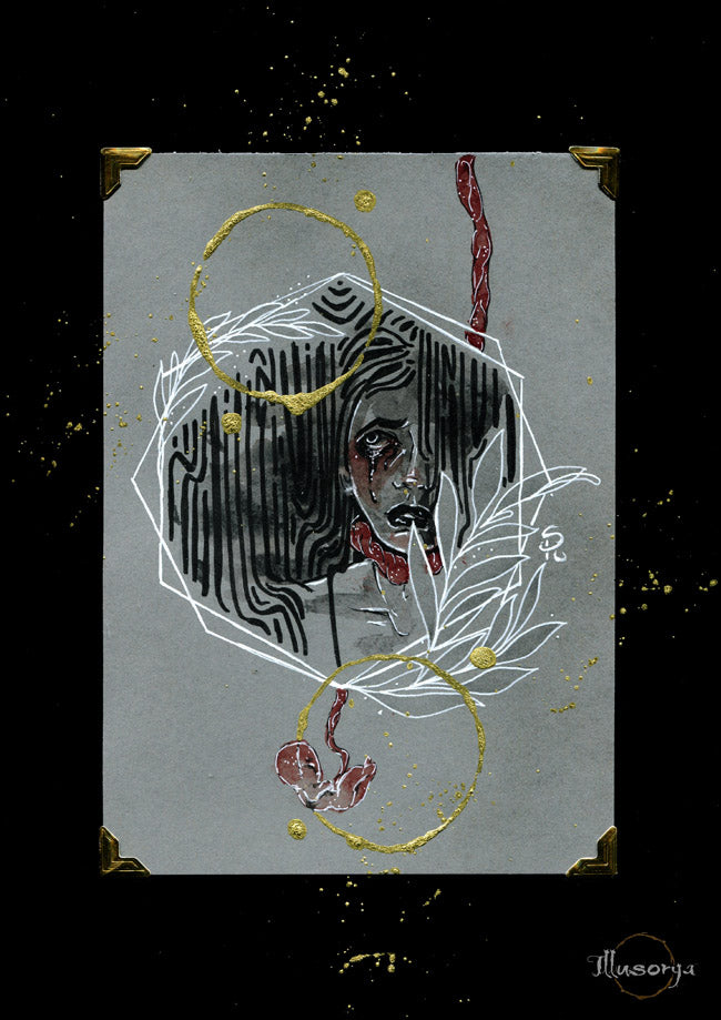 L'illustrazione è montata su "passe-partout", nero e china oro 21x30cm, pronta da essere incorniciata.