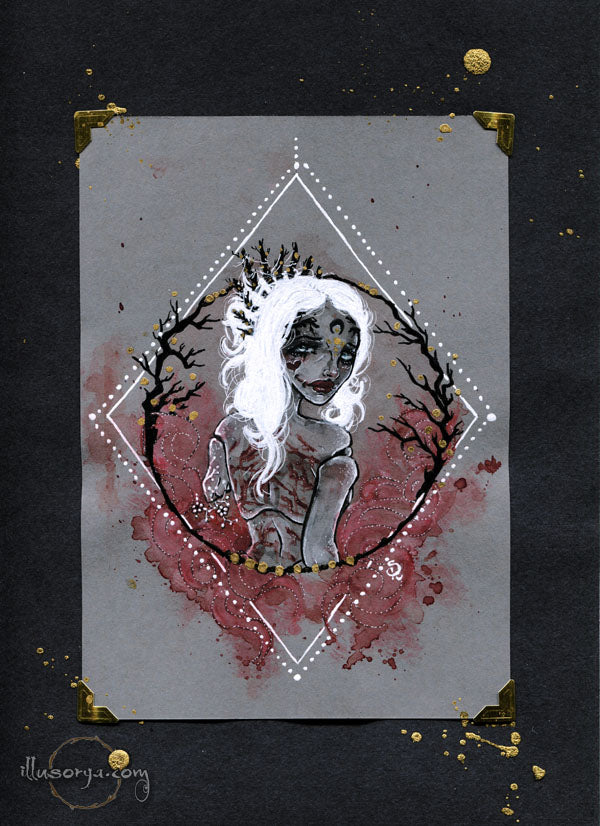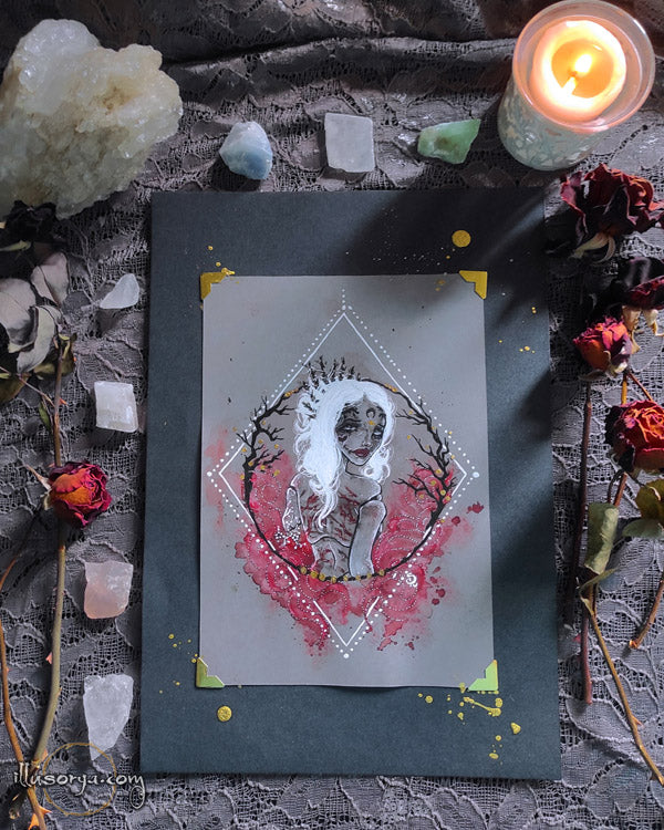 L'illustrazione è montata su "passe-partout", nero e china oro 21x30cm, pronta da essere incorniciata.